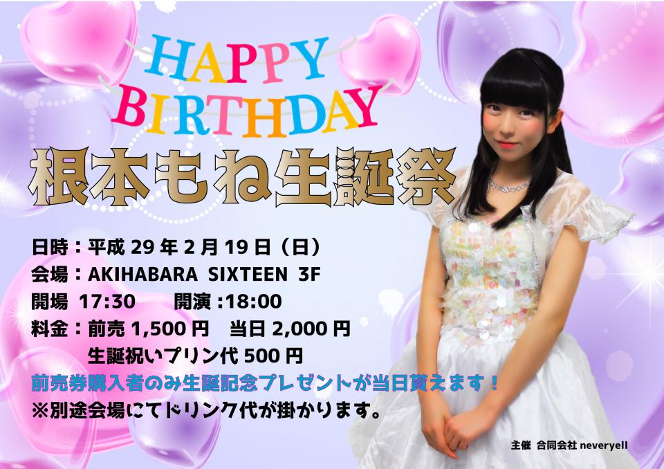 この度、根本もねの生誕祭を2月19日誕生日当日に行うことになりました。 場所はAKIHABARA SIXTEENにて 時間は17時30分開場 18時開演 今回は先日に起きましたストーカー事件もありましたので ファンの方の開催生誕…
