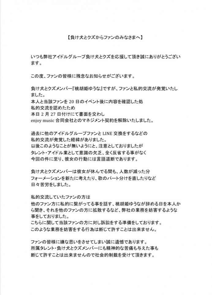 負け犬とクズメンバー 桃胡姫ゆうなについてご報告。 https://twitter.com/losingdogwaste/status/1497889278667681796?s=21 この度は、突然の発表となってしまい誠に申し訳ございません。 ご理解をいただきます…