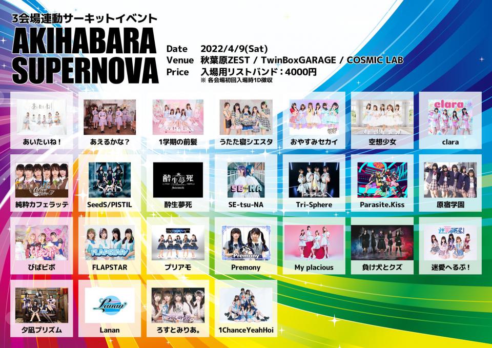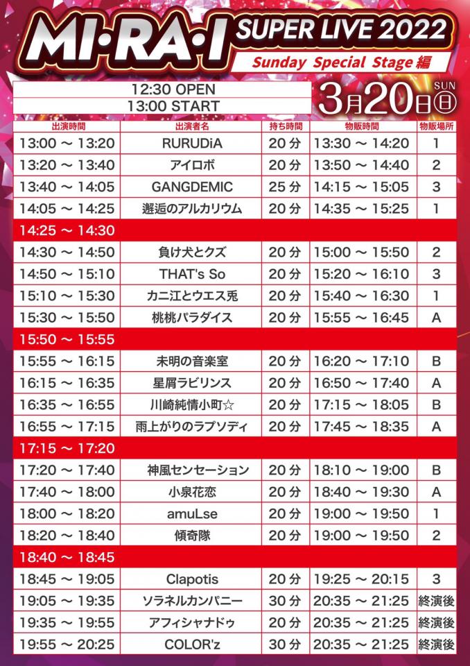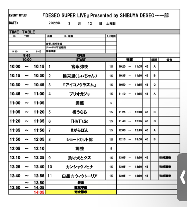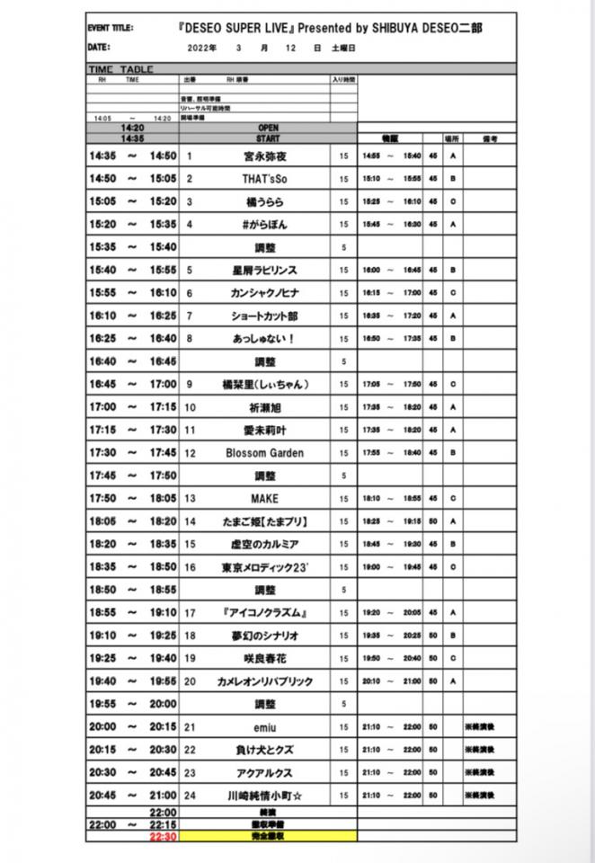 2021年3月12日(土) DESEO SUPER LIVE Presented by SHIBUYA DESEO 1部 【会場】渋谷DESEO 【OPEN/START】9:45/10:00 ※予定 【入場料】早割2,000円/前売2,500円/当日3,000円 (ご入場の際に別途ドリンク代をお… 詳細を見る